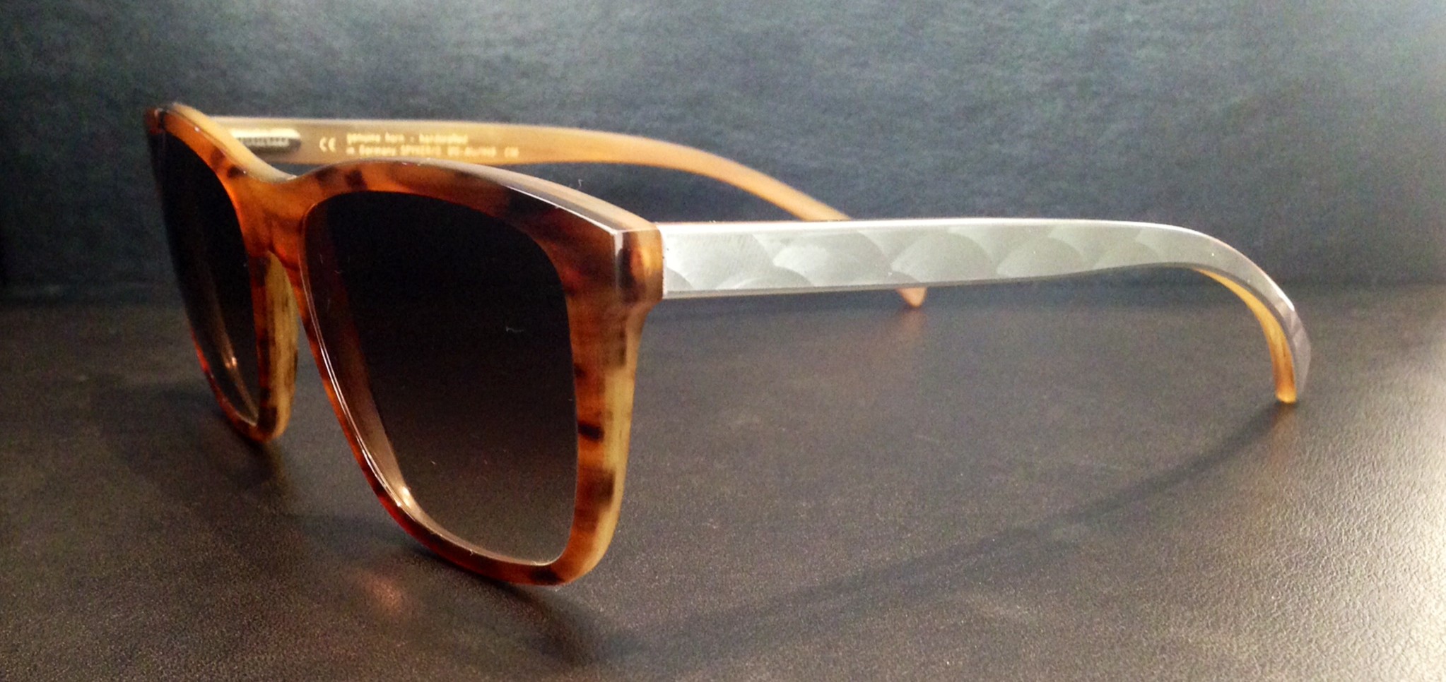 La face de la monture est en corne sculptée afin de laisser apparaître différentes couleurs. Les branches sont constituées de deux couches principales : la corne sur laquelle est appliquée une lamelle d’aluminium. Le résultat est moderne, technique et très tendance. Le métal lumineux actualise la corne de buffle, matériaux traditionnel par excellence. L’aluminium est travaillé méticuleusement donnant une impression de relief.